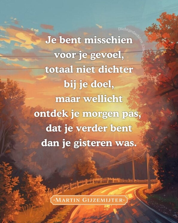 Kracht, Tegenslag, ZelfvertrouwenDichter bij je doel – Dichtgedachten 2264 Geplaatst op 26 maart 202619 maart 2026 door Martin Gijzemijter 26 mrt Vind je dit gedicht mooi?Deel het op FacebookLees ook:EenzaamheidKrachtKracht Martin Gijzemijter Vandaag is morgen – Dichtgedachten 2284