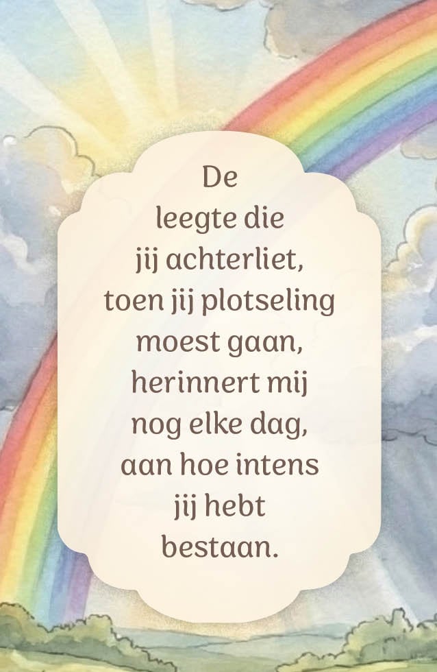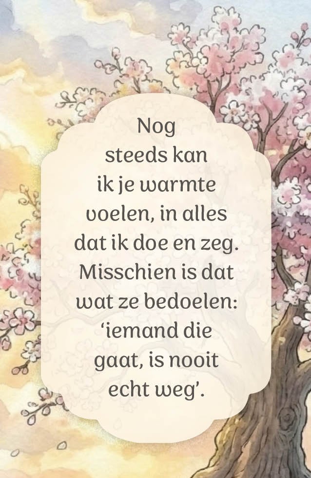 Mijn moeder pakt al een jaar lang elke dag een kaartje en heeft hier veel troost aan. Soms krijgt ze een huilbui maar juist dat lucht vaak op.